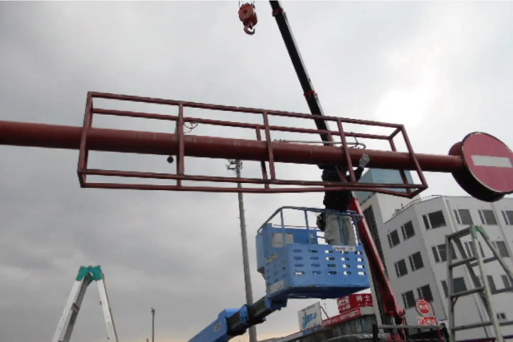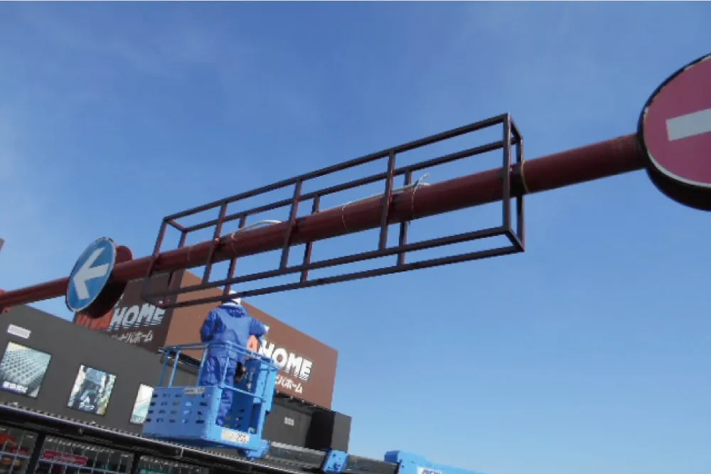 今回は工場で鉄骨の枠と看板の盤面を作製してから、現地で鉄骨の枠を溶接し、その上に新しい看板の盤面を取り付けました。