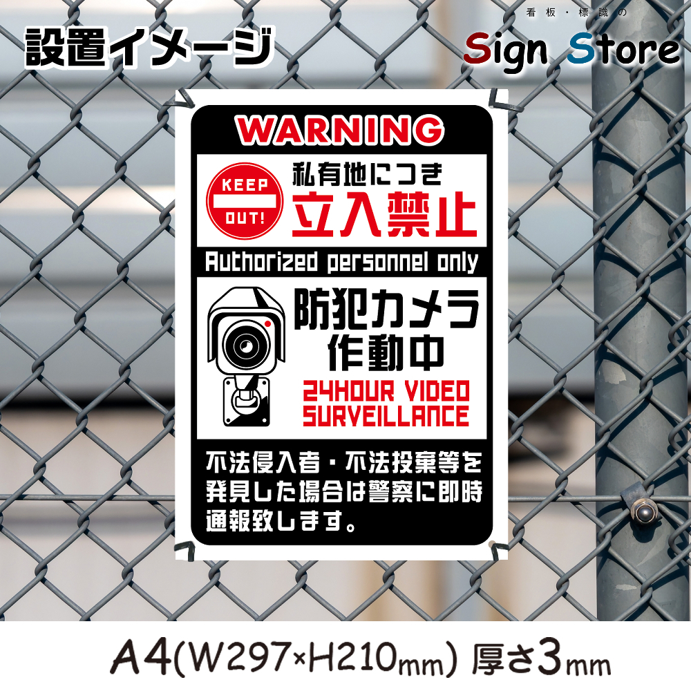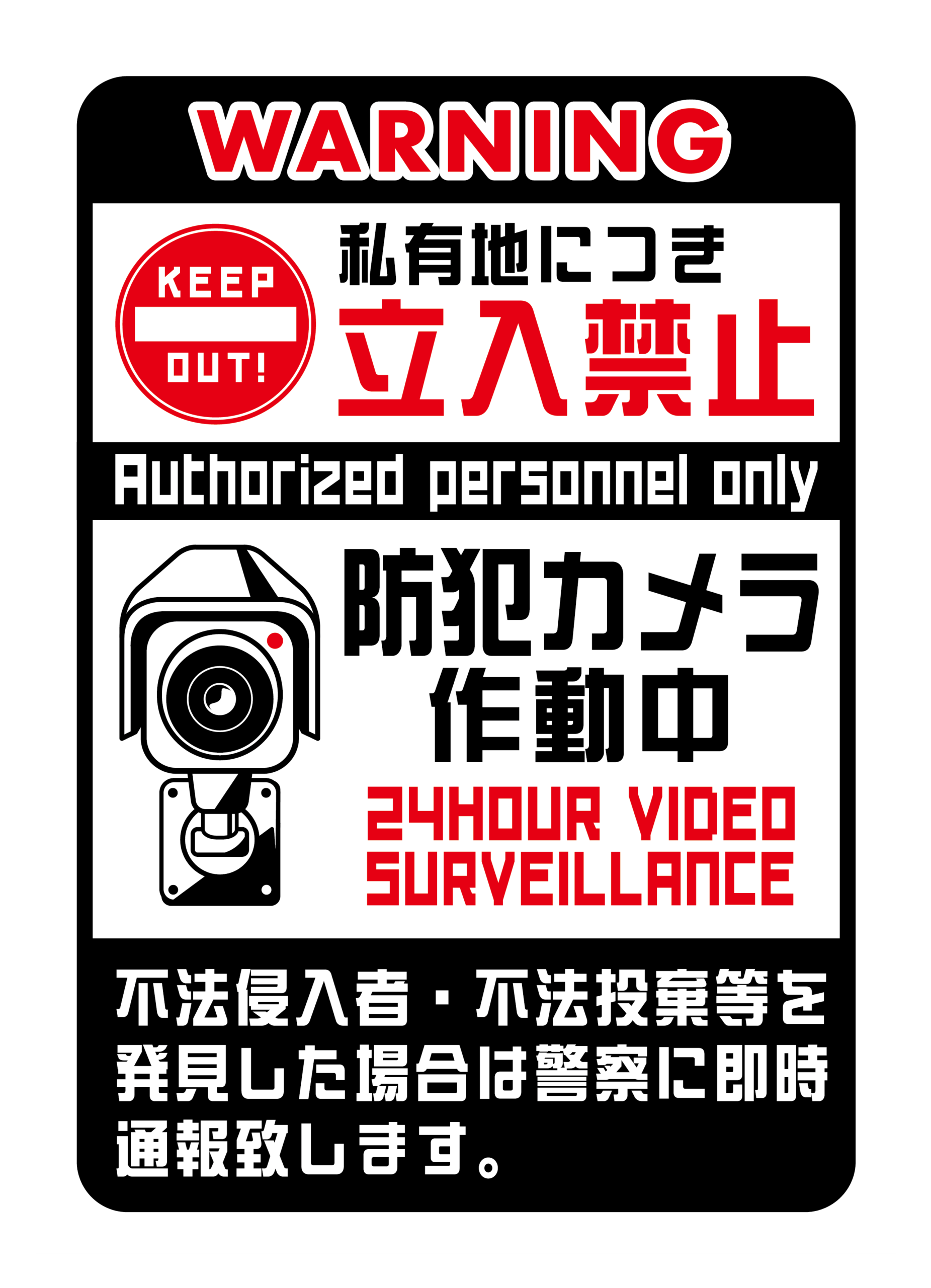 赤と黒の配色が目を引く、強い警告メッセージを込めた看板です。「私有地につき立入禁止」と「防犯カメラ作動中」の警告に加え、「不法侵入・不法投棄は警察へ即時通報」することを明記し、無断侵入を厳しく禁止します。セキュリティ強化とトラブル防止に役立ちます。