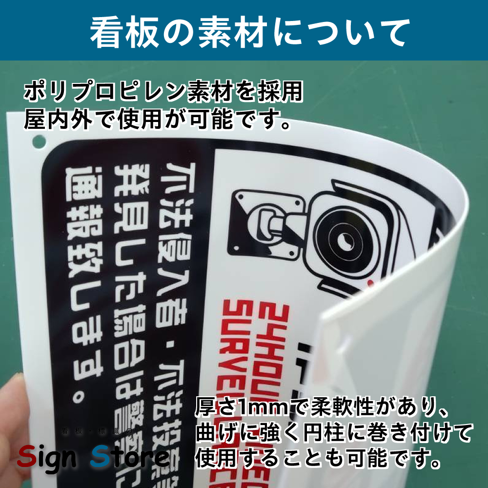 使い方:厚さ1mmで曲げにも強く、電柱のような円柱の曲面にも取り付けが可能です『耐水性』『耐腐食性』『耐久性』に優れたポリプロピレン製の看板です商品と一緒に・ボンド両面テープ・ビス止め・結束バンドの3つの取付方法が記載された説明書を同封します設置に必要な部材は付属しません 結束バンドやビス等はご用意ください。