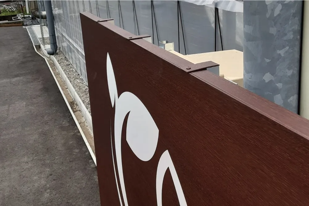 ベースのアルミ溶接枠にも木目シートを貼り込み、白色カッティングシートで文字とロゴを表現しました。