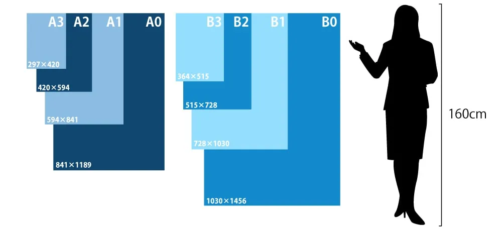 A0サイズのポスターは大きな用紙を広く使用することができ、かつ人の身長より少し小さいサイズなので、威圧感を与えずに遠くからでも様々な情報を伝えやすいと言えます。 -