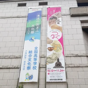 今回は横断幕・懸垂幕の解説から、少し珍しい表示面が両面あるタペストリーのご紹介をさせていただきました。