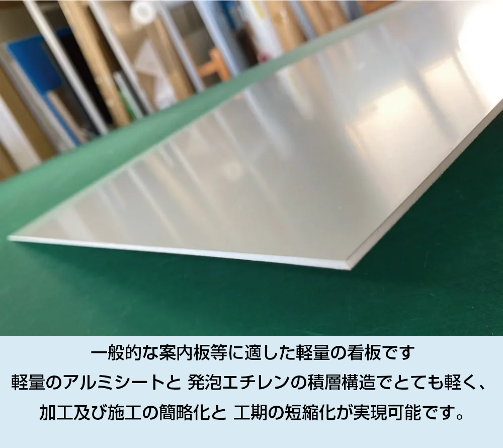 アルミ複合板は3mm厚、縦横サイズは1mm単位で対応可能、910mm×1820mm以上のサイズは分割製作