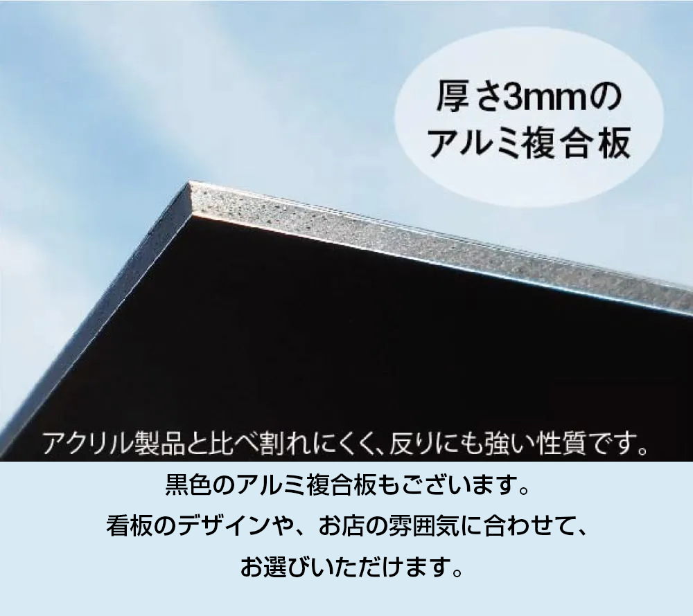 プレートはアルミ複合板(3mm厚)を使用します。軽量で耐久性があります。お店や会社の看板や、案内板、イベント用など、どこでも使用できます!