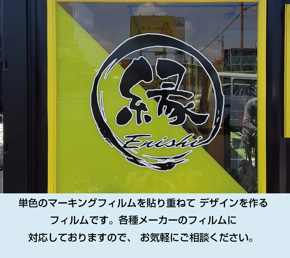 IJプリントシートは印刷をするため、グラデーションや写真も印刷可能です。屋内外用マーキングフィルムは単色で表現できるデザインの作成に向いています。